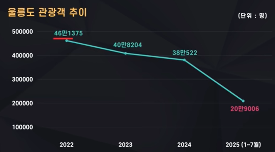 2024년 기준 울릉도 관광객 수는 전년 대비 약 50% 가까이 감소, 섬 경제 전반이 크게 흔들리고 있습니다.